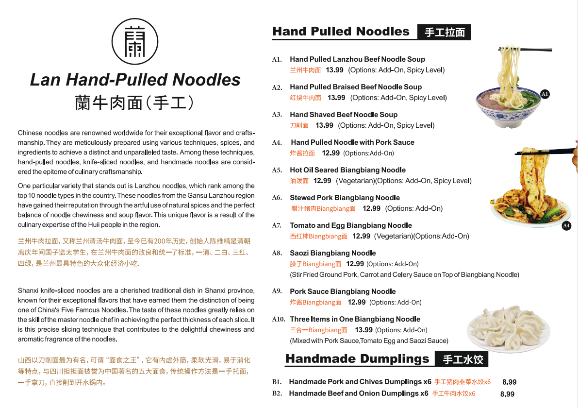 But beyond the impressive noodle-making display, the true star of the show is the food. Their menu boasts a variety of mouthwatering options, with the Hand Pulled Lanzhou Beef Noodle Soup (兰州牛肉面) standing out at just $14.99. This dish is a true celebration of flavors, featuring tender beef mingling with a rich and aromatic broth. If you’re in the mood for something slightly spicy, the Hot Oil Seared Hand Made BiangBiang Noodles (油泼辣子面) at $13.99 deliver the perfect kick, with thick, chewy noodles drenched in vibrant, flavorful oil. Meanwhile, the Tomato & Egg Dry Mixed Noodles (西红柿鸡蛋拌面), priced at $13.99, is a comforting dish that provides a taste of home with its simple yet satisfying ingredients.